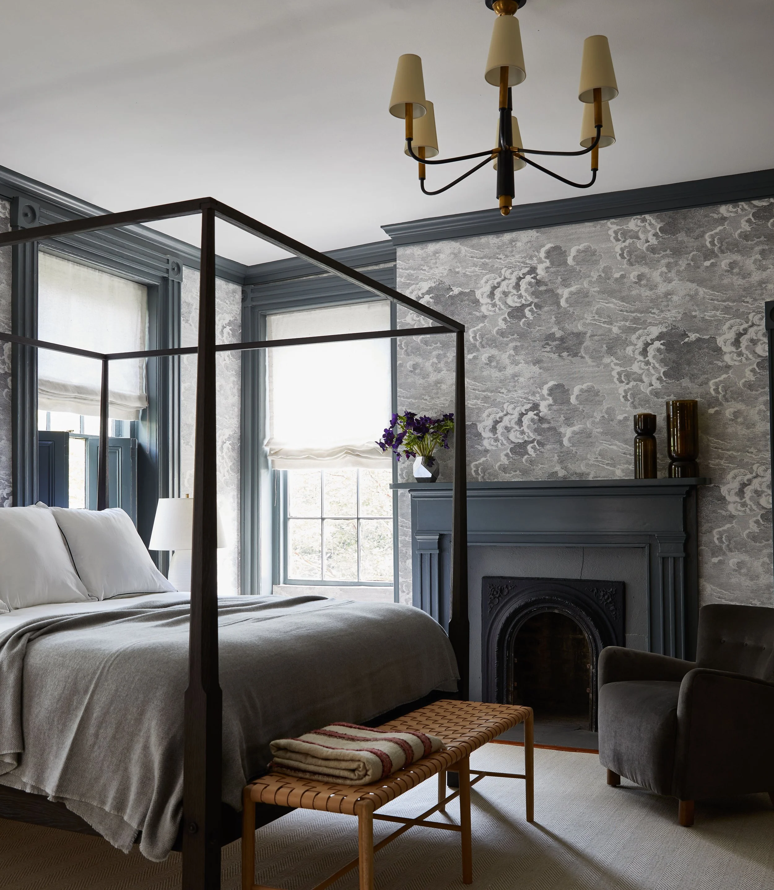 Since her client entertains frequently, Berry wanted the home to be a welcoming retreat, eschewing any notion of a sterile bachelor pad. In the dining room, she introduced a Gracie Studio chinoiserie wallcovering with a sophisticated tobacco ground, then tempered that flourish by stripping the existing fireplace surround to reveal its striking original wood finish. “I like to show age in that way and thought it was a nice, masculine touch against the elegant wallpaper instead of a perfect, glossy finish,” she says. The furnishings keep fustiness at bay, with a clean-lined cerused oak table, leather-upholstered Gustavian dining chairs, and modern lighting.