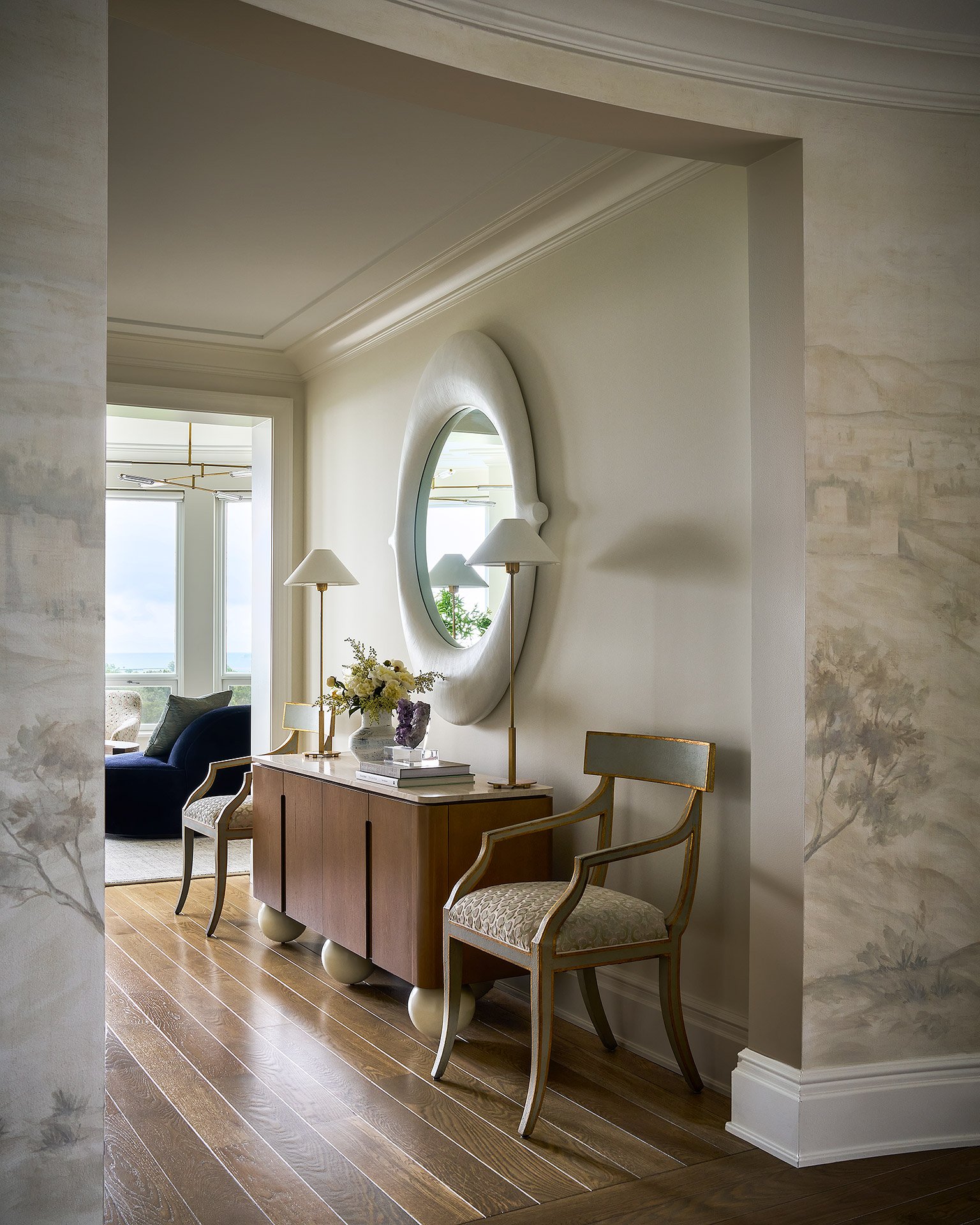 That concept was informed by the couple’s love of hosting friends and family, as well as their desire for this condo to reflect how they currently live. With five grown children and two grandchildren—all of whom have spent years in environments created by Dolenc and Riker—the owners were happy for their roles as consummate hosts to now lead the design. As such, the kitchen, dining room and living room have emerged as a trifecta of entertaining destinations, supplemented by David’s office, which easily converts to adjunct space for cocktails and dining. After more than 20 years in their previous residence, Suzanne notes, “We were ready for another way of living.”